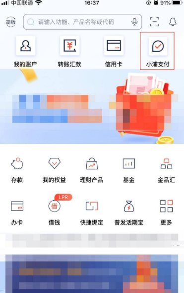 在“浦发银行”手机银行APP的界面中,点击上方的“小浦支付”图标。