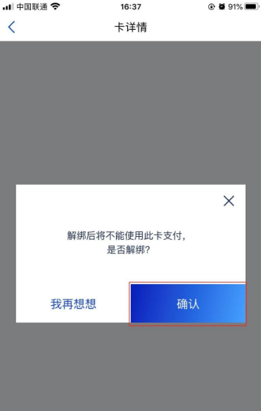 在弹出的“解绑后将不能使用此卡支付,是否解绑”提示框中,点击下方的“确认”按钮。