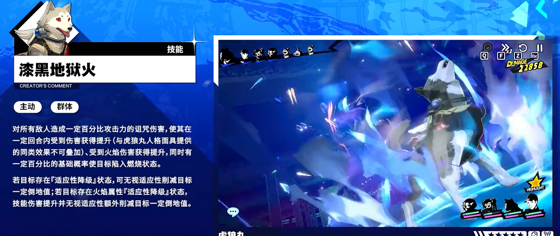 神通法叫黑色猎犬,消耗70点能量,打全体诅咒伤害,同时给所有敌人附上灵魂追猎,还能让敌人防御力降一段时间,这个技能算是整个输出循环的启动器,先用神通法把灵魂追猎铺上去,后面三个面具技能,才能发挥出更大的价值。虎狼丸的援助技能也比较实用,能永久降低所有敌人的防御力,同时给自己回一些神通法能量,这个永久降防的效果叠几次之后,全队的伤害都会有明显的变化。