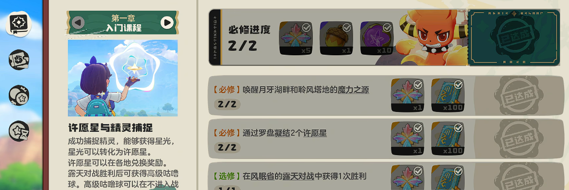 在完成主线的过程中,玩家们需要打开魔法手册,这个就是类似新手阶段的成就任务,这些任务的完成难度很低,但是能获取的奖励非常丰富,建议玩家们可以根据手册的成就一一完成,其中捕捉宠物这个成就是比较多的,建议玩家们看到没有捕捉过的宠物都需要第一时间捕捉,捕捉以后会获得较高的经验成长,还能丰富图鉴组成阵容,在前中期捕捉宠物是非常有必要的,其中罗隐捕捉优先级较高,因为该精灵的数值比较高,是后期攻坚pve副本的神宠。