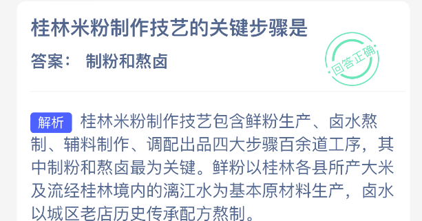 桂林米粉制作技艺的关键步骤是?【蚂蚁新村每日一题】2026年3月15日题目已发布!坚持答题,积累木兰币,即可加速小镇建设。答对本题,立即可享“产速+3/时”的加速奖励!今天正确答案是【制粉和熬卤】。桂林米粉制作技艺包含鲜粉生产、卤水熬制、辅料制作、调配出品四大步骤百余道工序,其中制粉和熬卤最为关键。