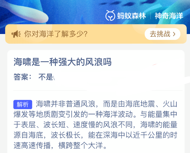 以上就是海啸是一种强大的风浪吗?神奇海洋今天答案最新2026年3月15日分享,更多相关攻略内容,请点击关注更新!