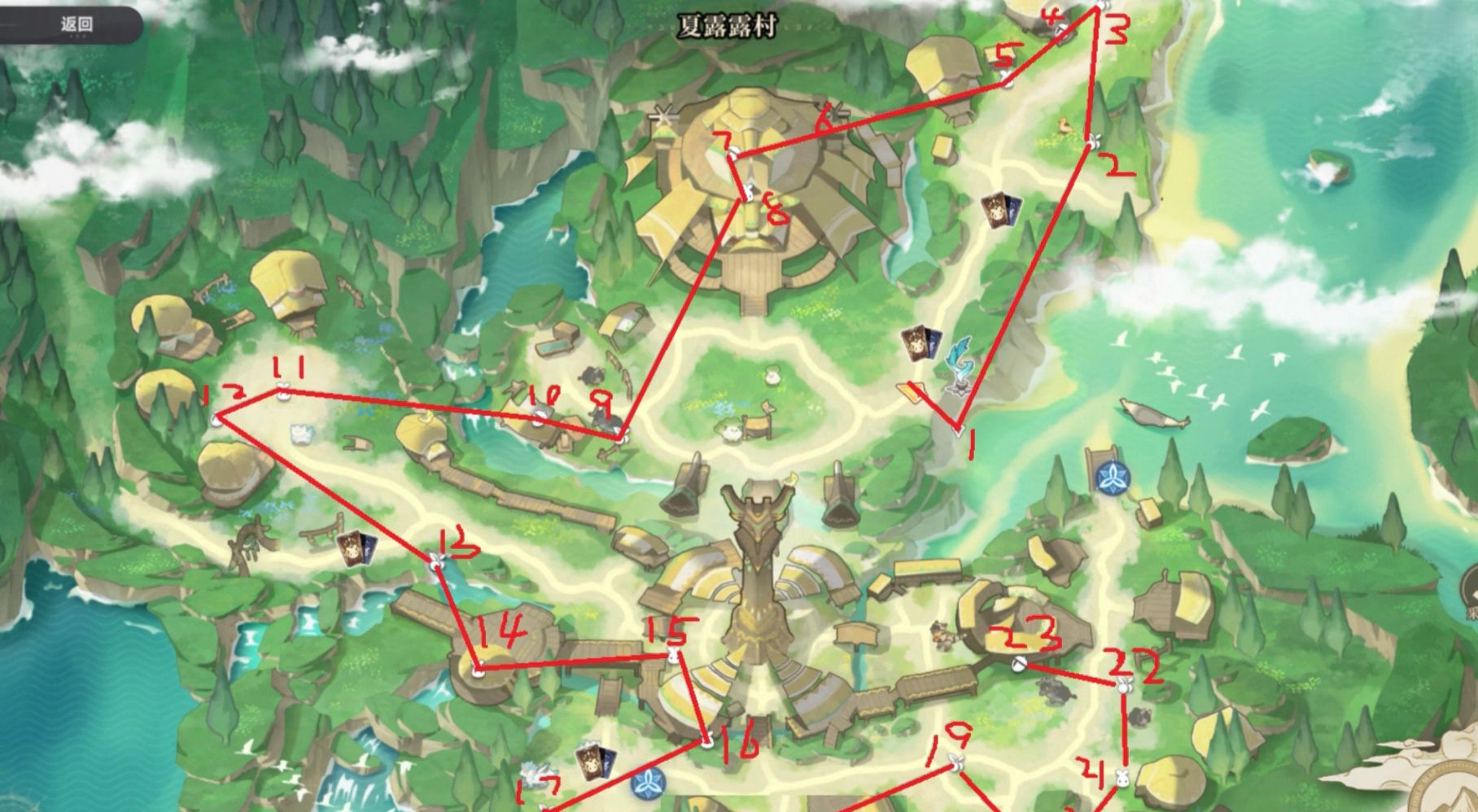 进入夏露露村开始收集之前,小伙伴们可以先准备几样东西,即:光、木、水、火四类奇波解谜以及图腾,装备好之后,就可以打开【世界地图】,看一下夏露露村的全貌,小编将需要前往的位置都在标注了出来,一共23处(如下图所示),这些位置除了是宝箱所在点以外,还包括了元素交互和乌咪挑战的位置。