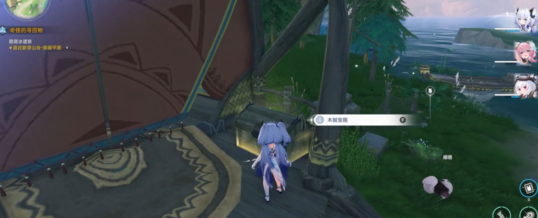 离开村长家后,直接往地图左下角位置进行跳跃,接着向前方移动就能发现第四个宝箱,拿完宝箱就可以向西移动,可以看到一个吊灯,吊灯旁边存在一个光系元素的交互。完成后就往地图的左边前进,跨过一处栅栏位置,会看到一座石像,石像前方是一个乌咪调查,乌咪调查的左边位置就是第五个宝箱。拿完宝箱就要往地图的东南方向前进,会看到一个木桥,过完木桥会在其左方看到元素交互。