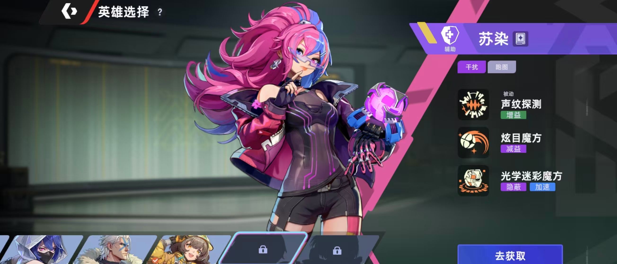 苏染是属于游戏中非常擅长跑图的辅助型英雄,她所具有的干扰能力在很多战术方面都有应用。被动技能声纹探测,苏染在室外停留超过3秒后,可以扩大30%收音范围,并且会提示声纹发出的距离。