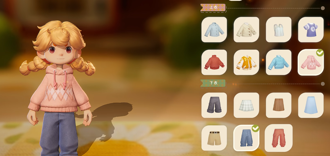 完成面部装饰以后,就是对服装进行搭配了,在新手阶段的衣服并不多,基本上衣服加上裤子的组合总共有8套的样子,并且衣服都属于基础款式,适合平时悠闲的时候穿,玩家们可以根据自己的审美进行搭配,一般只要颜色不冲突,搭配的形态都是比较好看的,后续可以通过任务以及活动来获取额外的服装哦。