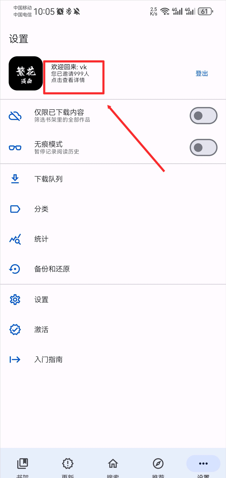 繁花漫画app怎么分享邀请码,打开app后完成账号登录,登录完成后点击账号名称查看详情,点击复制即可生成邀请码和下载链接,分享给朋友下载并填写邀请码。