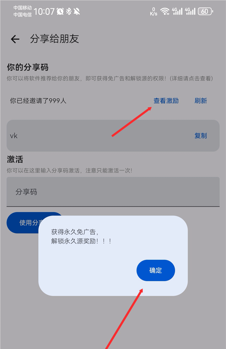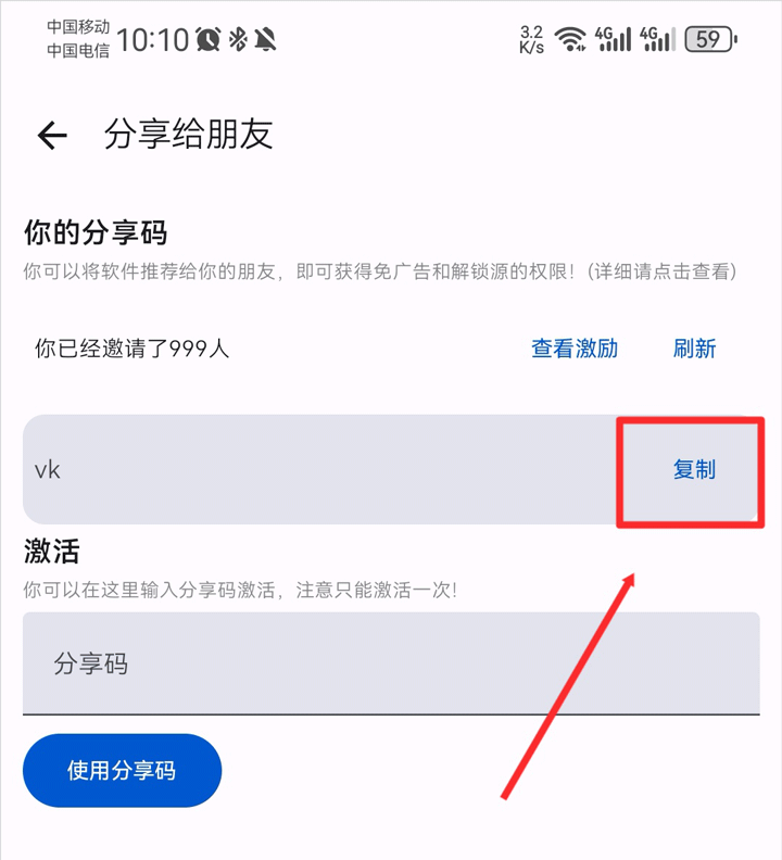 3、点击复制即可生成邀请码和下载链接,分享给朋友下载并填写邀请码。