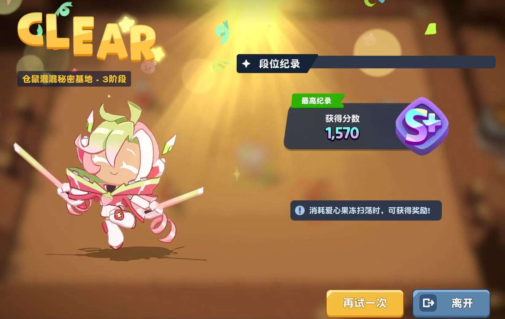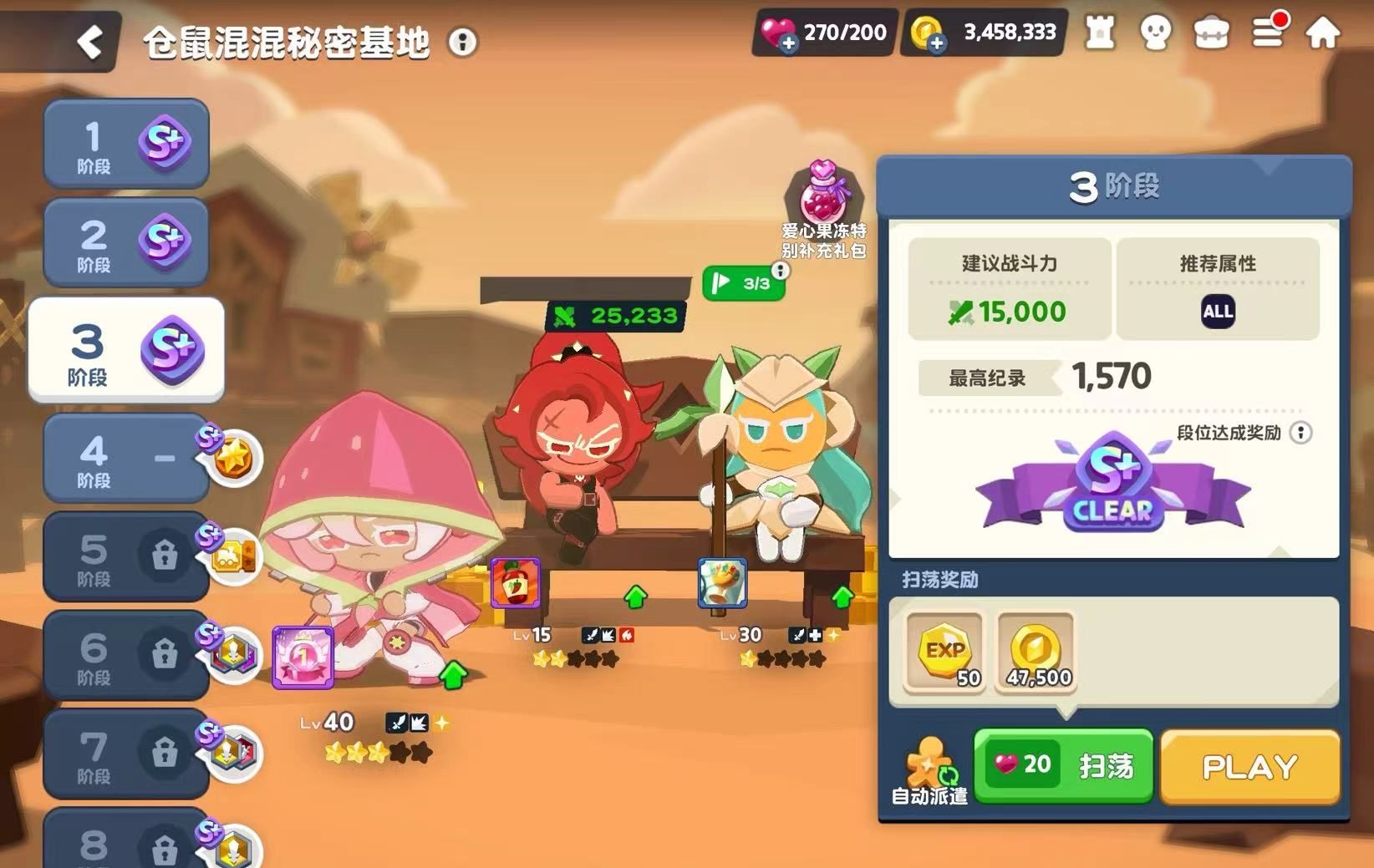 接着说第二个经验之塔:仓鼠混混秘密基地,和六角蜂森林一样,它也有着战斗力的要求,随着爬塔进度越来越高,也会出现推荐的饼干人属性。在这里大家能获得的挑战奖励是金币和经验,一阶段获得的经验是30点,金币为22000,8阶段获得的经验是160点,金币为135000。这个关卡中玩家们需要在规定时间内打败尽可能多的小怪,关卡会根据击败数量来给大家评分,最高为S+,能够拿到顶格奖励。