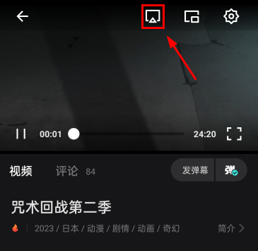 电影猎手app怎么投屏,首先在本页面下载安装电影猎手,然后找到自己想要看的影视作品,这里以《咒术回战第二季》为例,进入播放页面后,站到如下图所示的图案,直接点击就能进行投屏了。