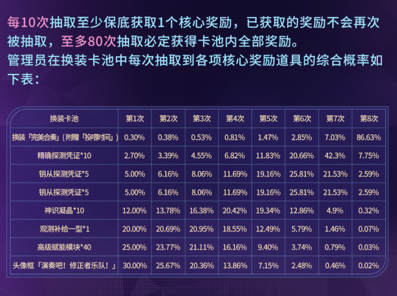 4周年登录就送移转之辉3000和限时精确探测凭证10个让你直接白嫖基础探测次数,使你快速的抽取到自己想要的道具。还可以通过完成日常任务,版本活动,览宙合版本任务、活跃度奖励等内容额外获取转移之辉。抽取建议必拿优先级,不灭王权·荷鲁斯完美合奏>主界面场景少女欢奏之夜。