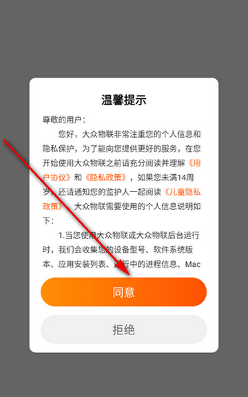 1、打开大众物联app,点击同意隐私政策