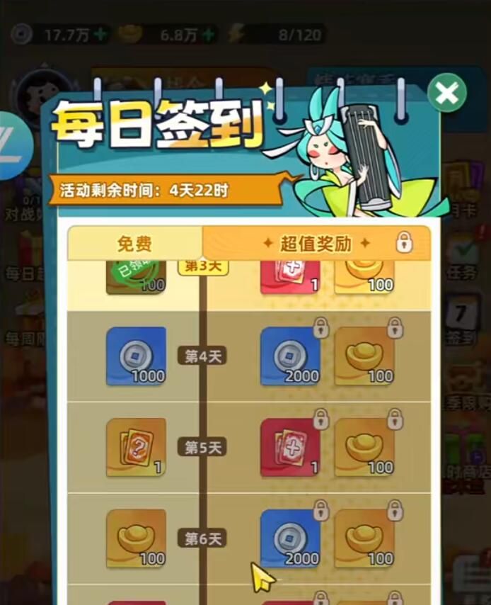 每日签到任务其实也能够让玩家获得福利,通常情况下是不会花费一点力气的,每天只需要登录游戏点一下就能够获得,一旦可以累积到7天的样子,此时玩家就能够领取神话英雄跟元宝,体力等等。神话英雄其实在游戏前期的时候是特别重要的,因为它能够帮助玩家建立阵容。
