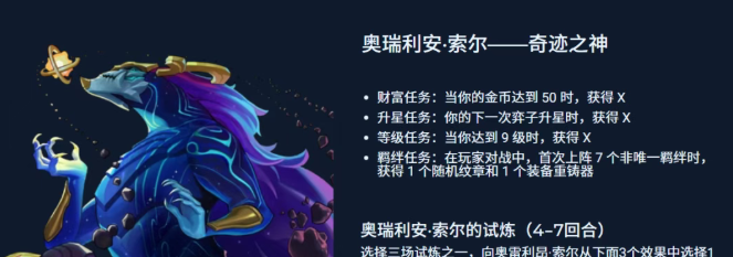 羁绊强化型阵容:选择奥瑞利安·索尔,通过完成财富、升星、羁绊等任务,可获得随机纹章、装备重铸器等,助力凑出高阶羁绊。