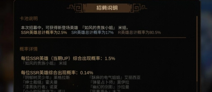 根据官方的卡池介绍,游戏中SSR角色的抽取概率是2.5%,SR角色的概率是17%,R角色的概率是80.5%。这些概率在众多的卡牌手游中是比较常见的,基本符合大多数玩家的预期。但是具体的出货率中有些值得我们注意的地方,尤其是对于up池的SSR角色来说,其综合出货率为1.5%,而每个up池SSR的综合出货率为0.14%。因此,虽然SSR概率很低,但是每次up池中SSR角色出现的几率很小,玩家想抽到自己喜欢的角色需要多次尝试。