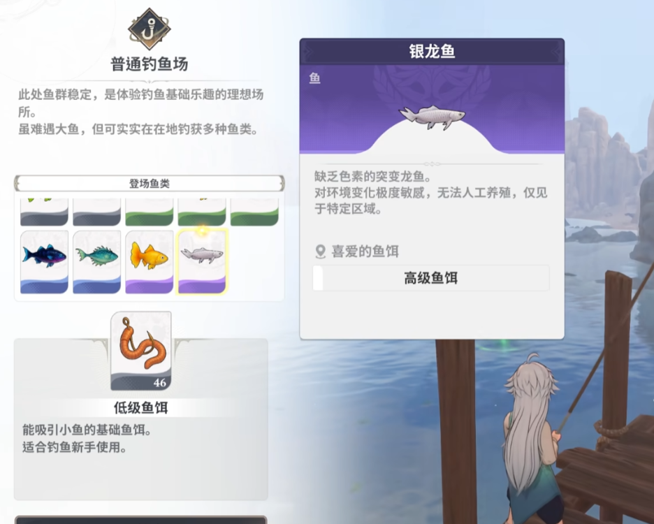 银龙鱼以银白色鳞片而闻名,在阳光下会发出耀眼的光芒,是沿海钓鱼场里不可多得的珍品,也是制作某些海洋主题道具所必需的材料。