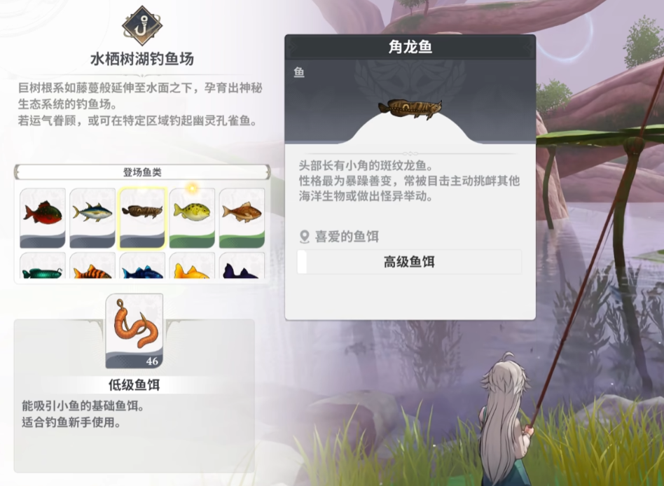 在这片森林深处有条宝贵的龙鱼,其中一条就叫角龙鱼。该条鱼的获取途径比较广,给玩家提供两种选择,既可以去森林关卡的普通钓鱼场碰运气,也可以去水栖树湖钓鱼场。
