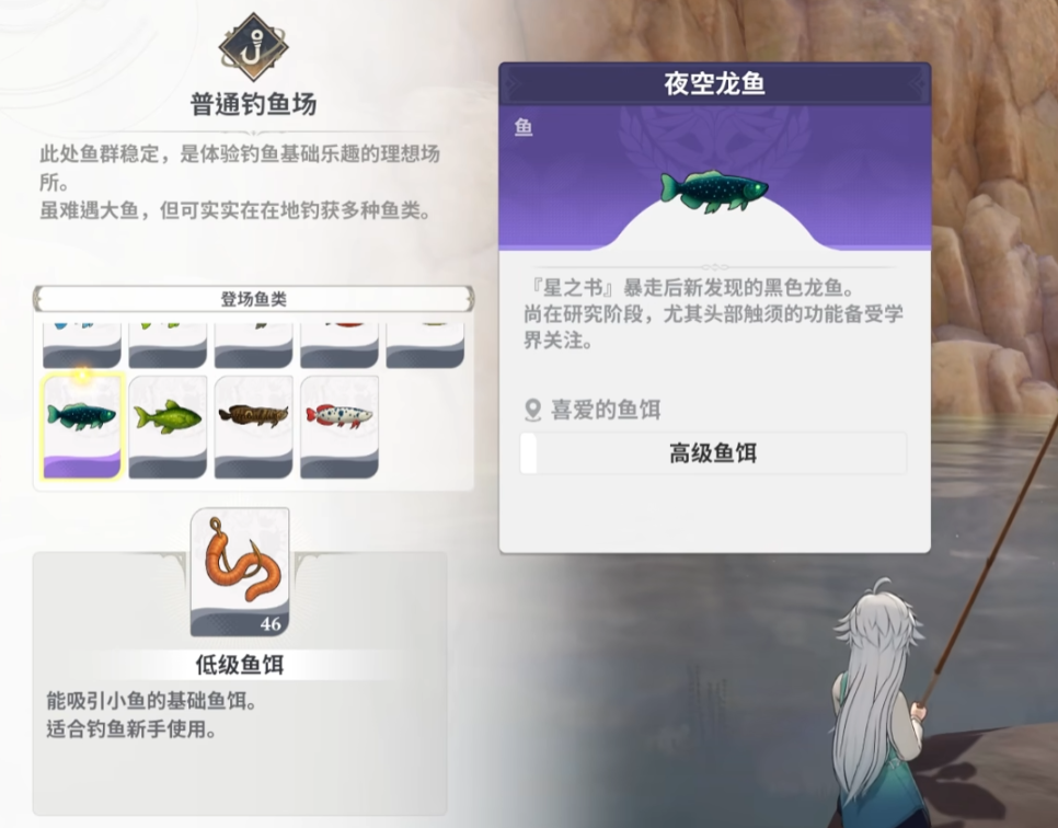 同样栖息在森林区的还有夜空龙鱼。虽然它和角龙鱼一样可以在森林关卡的普通钓鱼场得到,但是它们的生态习性却大相径庭。夜空龙鱼把天上的星辰融入到鳞片里,在夜晚垂钓的时候更容易找到它的踪迹。森林关卡属于游戏早期或者中期的区域,玩家对它的地形比较熟悉,这就为夜空龙鱼的捕捉创造了条件。玩家在森林主线任务空闲的时候,在密林树冠之下可以找到类似夜空般的深邃鱼影,在安静的森林里独自垂钓。
