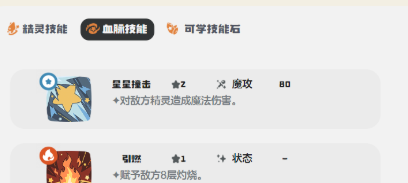 入场时不同血脉可以赋予自身增益,还有削减敌人的属性,可以给队友抢占先机。技能搭配就是核心,主要的就是伤害和功能结合,新手直接照抄就能够使用。输出核心就选择星星撞击和荆棘爪,可以打出80点高额魔法伤害,还可以补充80点物理性伤害,魔武双修就可以覆盖不同类型的敌人。功能技能,那自然就应该选择引燃,可以给对手挂上8层灼烧,搭配火属性精灵,就可以迅速的实现伤害翻倍。在打持续输出时是比较好用的。