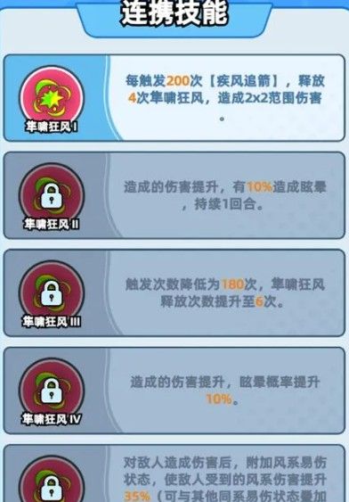 连击范围收割:每触发200次【疾风追箭】(3级后180次),释放1次2x2范围伤害,2级起附带10%-20%眩晕概率,补足风队AOE短板。