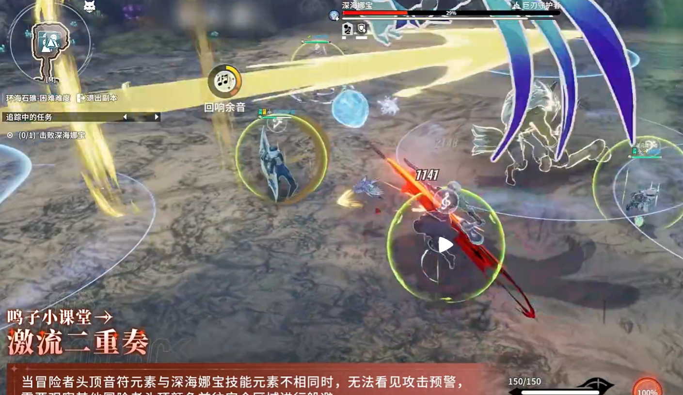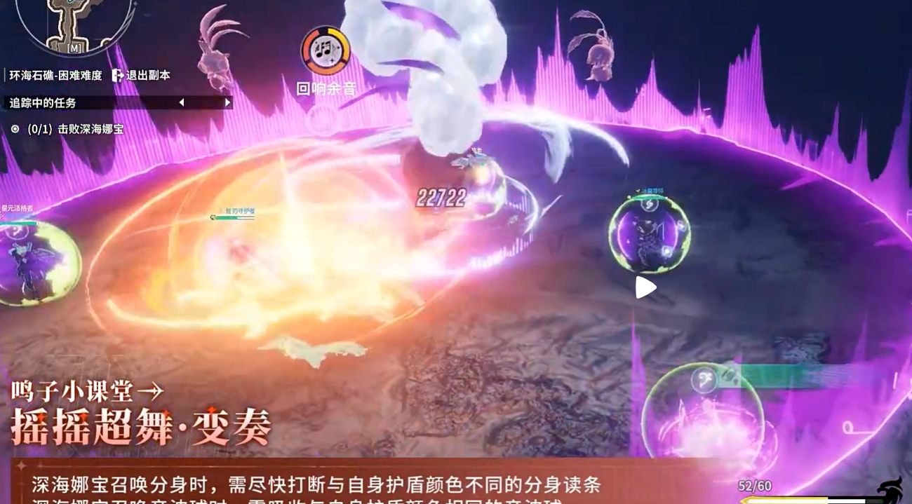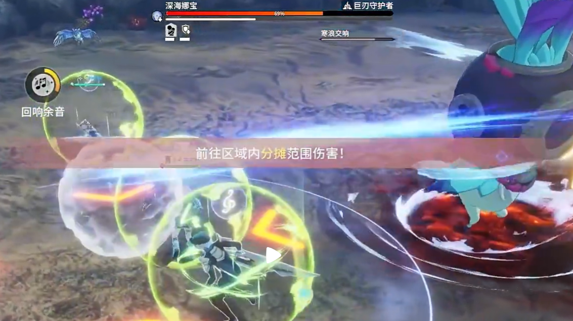 打了一段时间后,深海娜宝会点名全队,然后玩家周围会生成水泡,接着放出大范围的全屏攻击。这里的处理方法并不复杂,关键是要进到和自己头顶音符相同的水泡里。只要进对了,就能安全躲过这波伤害。要是站错泡泡,或者反应慢没进去,吃到的伤害会很高。这一段看起来不难,但实战里很容易慌,所以在点名出现时,先确认自己是什么标记,再马上找对应水泡,效率会高很多。