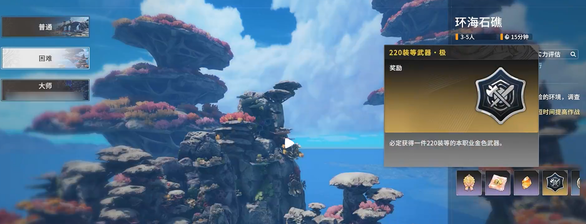 环海石礁现在开放的是普通和困难难度,后面还会继续开放更高难度。副本奖励还不错,通关后可以拿到220装等的金色武器,也能拿到220装等重铸石,用来继续提升装备。除此之外,还有“蚀梦星沙·时礁”、“蚀梦晶石”这些材料,可以拿去换赛季外观和别的资源。另外还有“烬空回响共鸣印记”,能在精英商店里兑换需要的物品,所以这个副本不只是开荒时要打,后面也有重复挑战的价值。