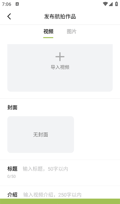 3、上传你拍摄的航拍作品、封面以及填写标题介绍等,完成后点击发布;