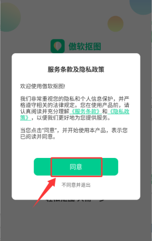 傲软抠图app怎么抠图,勾选同意相关服务条款后,点击"手机号登录"进入应用,在服务条款及隐私政策窗口点击"同意",进入主操作界面,点击主界面"一键抠图"功能,实现智能去背景等编辑操作。