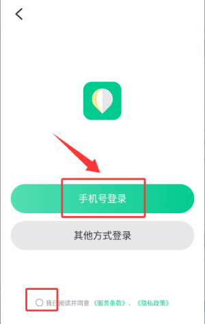 1、勾选同意相关服务条款后,点击"手机号登录"进入应用。