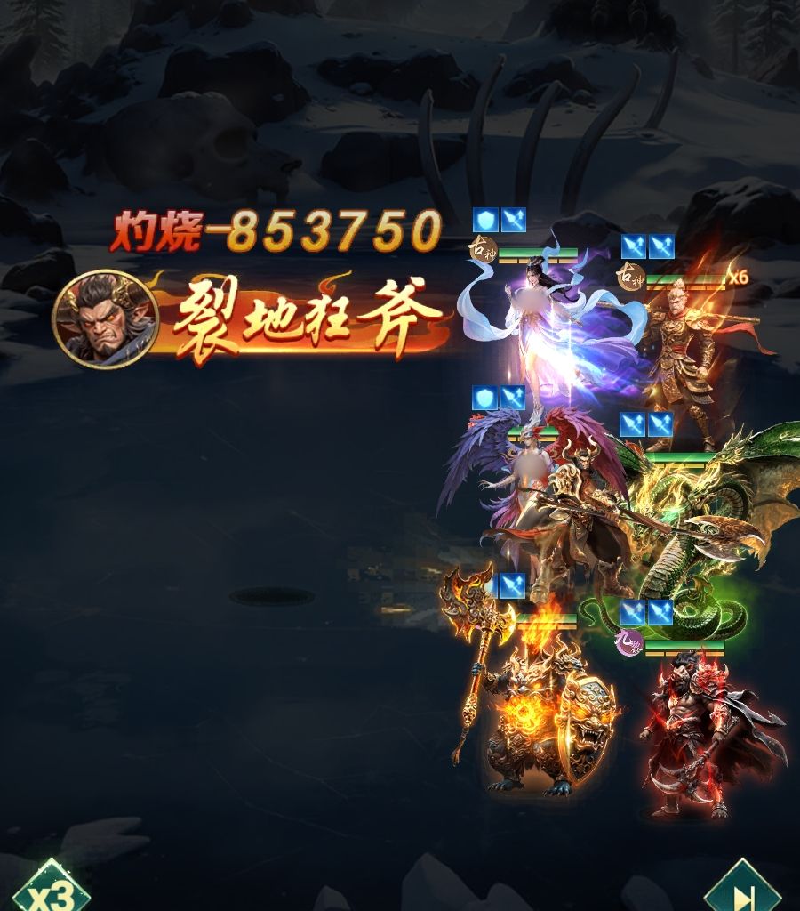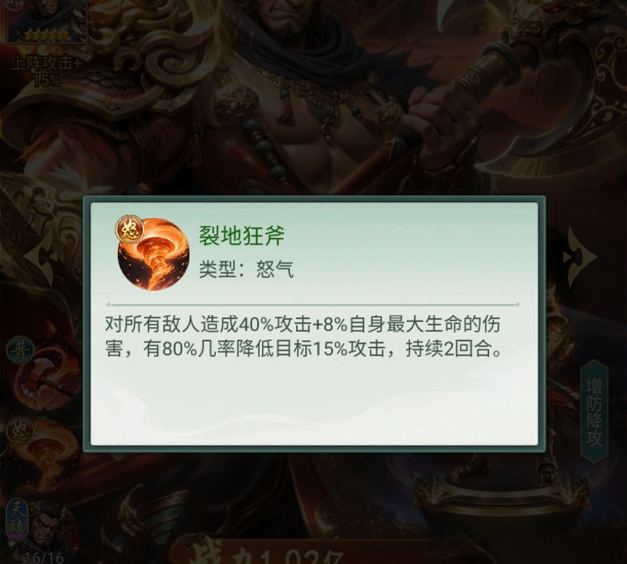 核心输出兼控场技能“裂地狂斧”为怒气技,伤害计算基于平天大圣自身最大生命值,对敌方全体生效。该技能附带攻击降低效果,触发概率稳定维持在80%,实际战斗中通常可覆盖3至4名目标;在高密度敌阵场景下,有较大概率实现全员减攻。为最大化此机制收益,推荐将其置于首发位置,优先触发减攻debuff,为后续队友输出创造有利环境。