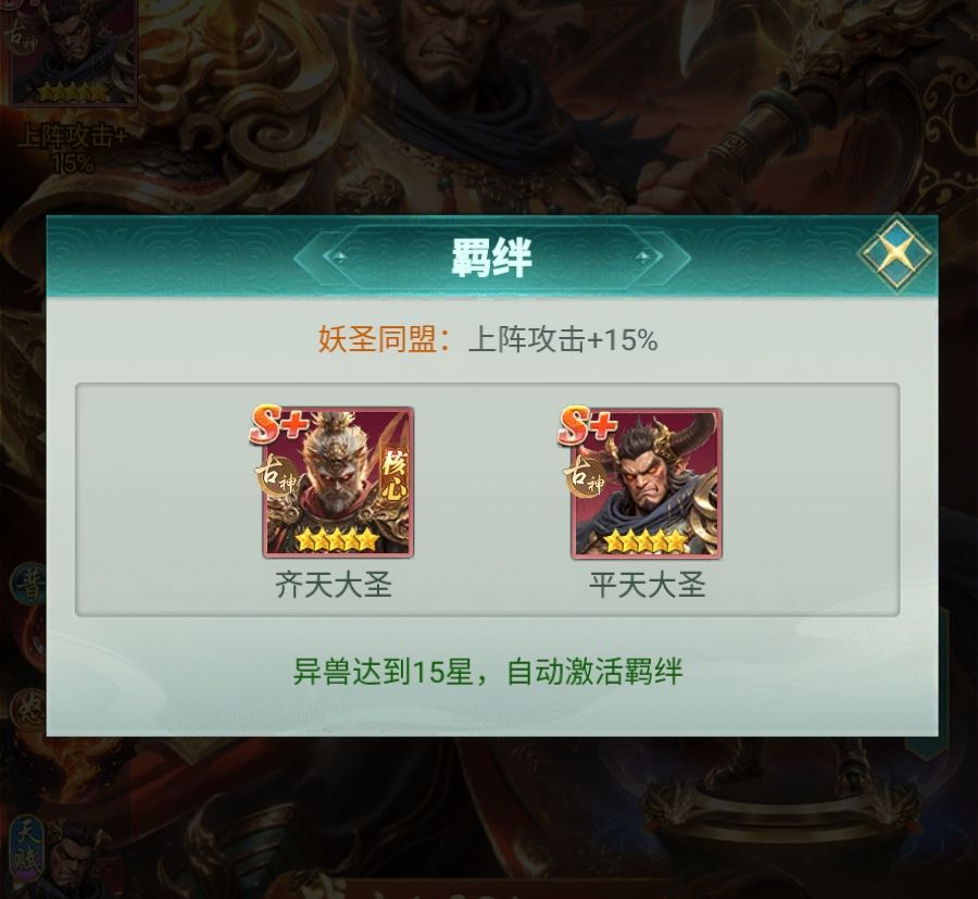 平天大圣与齐天大圣存在专属羁绊,两人同时上阵可共享15%攻击加成。由于齐天大圣在古神阵营内协同性极强,因此平天大圣天然适配古神体系队列,承担前排抗压、群体减攻、同排增防三重职能。即便玩家尚未集齐完整古神角色,也可将二者组合纳入混搭阵容,在非纯古神队中持续发挥减攻与防御支援作用,机制兼容性良好。