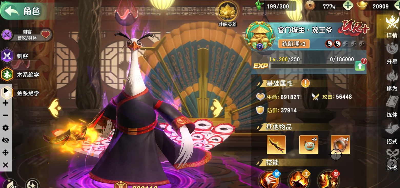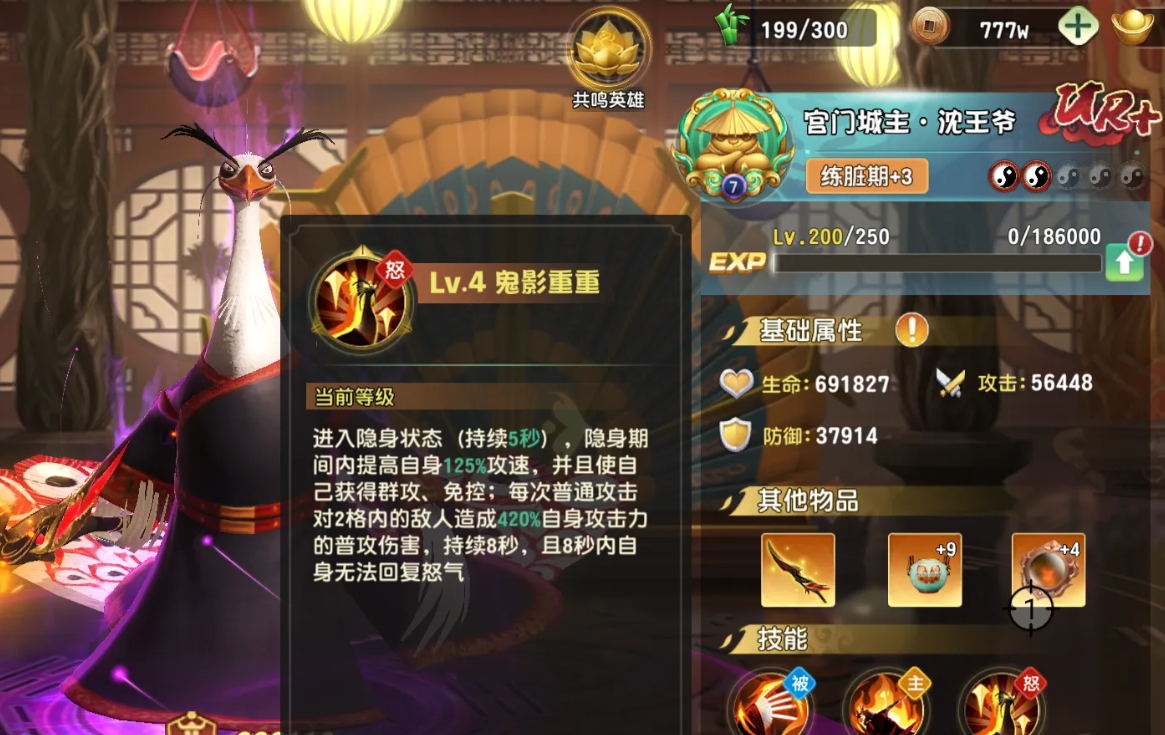 这是沈王爷的ur+卡,是游戏内目前稀有度最高的卡。定位是刺客,绝学是木系和金系,特点是有范围群体伤害、攻速高,而且爆发足,虽然有一定的自保能力,但是续航比较弱,整体偏向于输出定位。