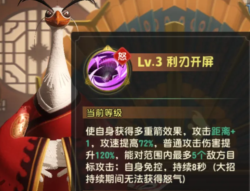 主要怒气技能利刃开屏,激活技能后,沈王爷获得多重箭效果,是可以攻击的距离增加一格,还有加七成攻速。这个技能属于群攻,能够同时命中5名敌方目标,清场的效率非常高。与此同时,技能附带的8秒免控,让他在密集交火也能稳定的输出,非常适合推图清杂怪。