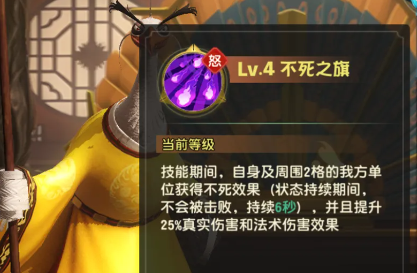 不死之旗是一个辅助类型的怒气技能,开启之后,沈王爷和周围两格的友方获得不死的效果,也就是不会阵亡,同时叠加真伤和法伤。此外,还有一个主动光环技能也比较重要,开启以后给两格以内的友方单位加暴击和每秒的攻击力数值回复,可以说他是团队推进和持久战中的优良辅助位,常常用它来搭配纯水属性阵容。