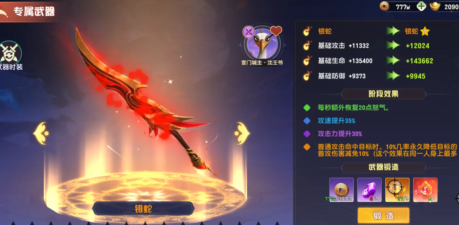 专属武器:银蛇,这是一把匕首,只能配给宫门城主沈王爷装备,锻造升阶可以提升怒气值、攻速、攻击力,以及普攻命中有10%几率永久降低目标的普攻伤害减免10%。