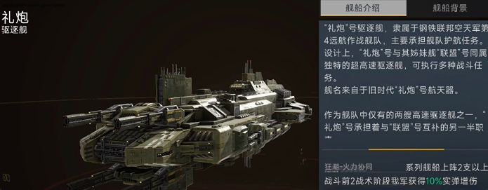 游戏当中礼炮的定位是驱逐舰,在这里可通过装备各类模块或者是配件来增强该战舰的攻击能力,驱逐舰在整个战队中可以说是持续续航的关键所在,而这艘战舰不仅可以装备多种弹药,而且还可以承载超多的战斗内容,建议玩家首先对其弹药能力进行提升,并且完成其能爆属性的提高,在战舰配对的选择上,彼得大帝、联盟都是不错的选择。同系列战舰上阵两只及以上的话,阵前二阶段战术中,己方将获得10%的实弹增伤,这个增伤模式足以让一些难啃的“硬骨头们”快速垮掉。
