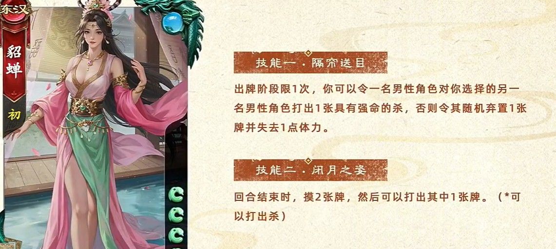 以上就是小编整理带来的名将杀武将貂蝉有什么技能,貂蝉技能介绍,更多相关游戏攻略,请关注!