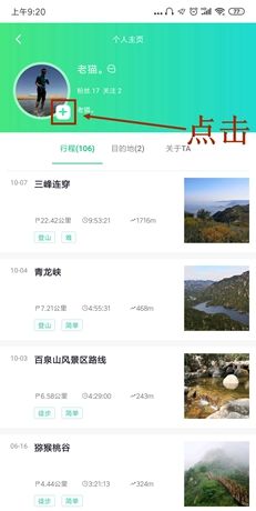 打开六只脚App后在首页下拉浏览,找到你感兴趣的户外驴友或旅行路线,点击进入该用户的行程页面后,再点击该用户的头像进入其个人信息界面,最后点击头像右下角的“+”号即可关注该用户并加为好友。关注成功后,你可以在“我的”页面查看已关注的用户动态,并与志同道合的户外爱好者交流互动。