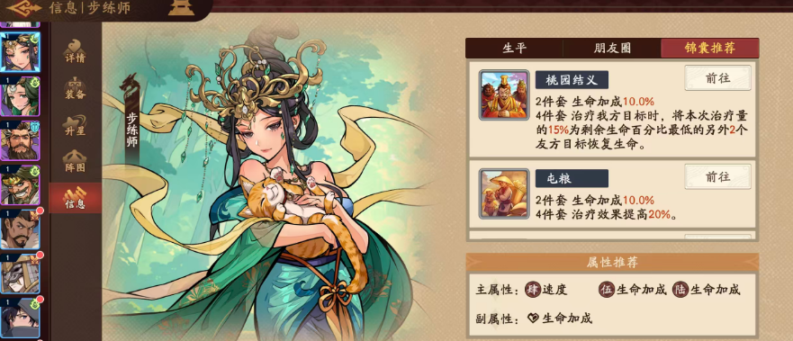 装备养成策略需聚焦功能性优先级:速度属性为第一核心,直接影响技能释放顺序与治疗响应时效;其次为生命值成长,保障生存与治疗基数;副属性可通过锦囊进一步补充生命加成。需注意,步练师并非传统坦克,其强度不依赖高额血量堆叠,而在于治疗效率、转嫁精度与增益覆盖率的协同优化。因此,速度达标后的生命提升,应以“支撑治疗上限”为基准,而非盲目堆砌防御数值。