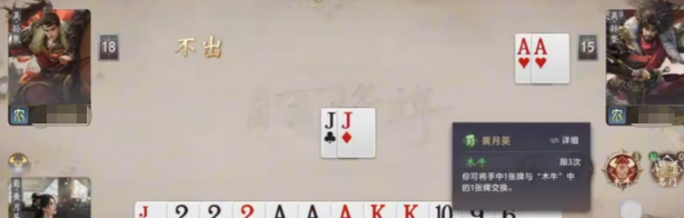 黄月英在各种模式中所表现出的灵活性也不能忽略。斗地主或者类似的牌多出牌频繁的时候,她会因为“巧械”而得到很多高价值的牌,在关键时刻依靠“木牛”逆转局势。地主身份的轮次优势使她容错率高、操作空间大,在农民或者人数较多的对局中,她的技能就必须要更加谨慎地使用,每一次交换都要经过权衡,不能因为贪图一时的利益而陷入被动。对于策略感兴趣者来说,黄月英就给他们带来一种非常刺激的体验。