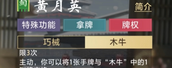 主动技能木牛才是黄月英真正的杀器。每个有限次,只能用一次,玩家可以从手中的牌或者木牛里拿牌进行交换。所以黄月英的出牌基本上无法改变现有的局面,不论是凑成炸弹、顺子、顺牌型这些其他的牌型,出牌都会使自己的优势倍增。该技能虽然强大,但是次数有限,即每次使用都会需要玩家进行精心的考虑和把控,而时机的把握好坏又会直接影响到整个牌局的发展。
