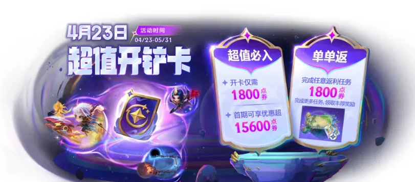 1、4月23日更新后-5月31日23:59,使用1800点券开通超值开铲卡”,完成任意返利任务即可获得全额开卡点券返还,更有全新传说级竞技场“天空之镇”、开铲季棱彩兑换石等丰富奖励等待弈士们解锁。