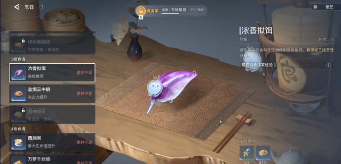 第二个关键条件那就是正确的使用鱼饵,只有合适的鱼竿是不足够的,鱼饵的选择就会直接决定垂钓的成功几率。钓褐斑龙鱼必须使用浓香拟饵,这一个鱼饵就是高级的诱鱼神器,可以大幅度的吸引稀有鱼上钩。而这一个鱼饵的制作地点就是烹饪台。玩家就需要准备香料鱼粉,还有鱼果木两种材料。不少的玩家可能会忽略鱼饵的重要性,只是使用普通的鱼饵,难怪怎么样都没有办法成功的垂钓。