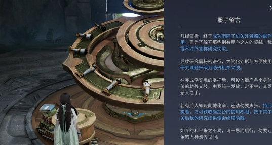 阅读完毕之后,就算完成了这一步的线索收集。看完试验记录之后,转身从2楼跳下来,顺着之前打开的洞口,然后进入到地下区域。进入地下之后就可以直接触发战斗,把地下房间里面所有的小怪全部的清理完毕。清理完毕之后,不要着急着往外走,可以在房间的角落里面找到隐藏开关,攻击开关,打开暗门,这里就能看到一个宝箱。拿完宝箱之后继续往深处走,在角落就可以找到一个可破坏的箱子。那么完成这所有的一切之后,墨子当年的研究成果就会出现在大家的眼前,玩家可以看完墨子的留言,然后自主的选择把一切留在原地或者是隐藏起来。
