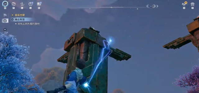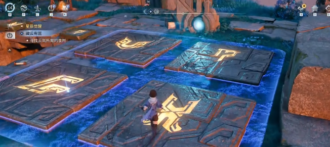 当我们跟随主线剧情推进到青野遗迹,清理完场地内的所有怪物后,可以看到场地的中间有几块石头,而其中有一个是亮着的。大家可能会比较好奇,为什么有一些视频里面的石头四个都是亮的,那是因为玩家早就已经完成了所有的任务。没有解谜的小伙伴们没有必要过于的纠结,玩家可以先站在初始的位置,看到地面上有一些碎片,没有必要去理会。视线转移到左侧,找到第一根可以交互的柱子,靠近之后点击交互键攀爬到柱子上。后找到上面的机关,开始旋转铁球。