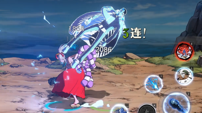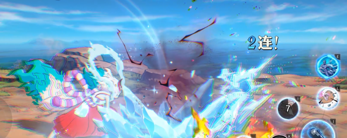 人形态一技能具备两段式释放结构:首段为中距离突进横扫,附带冰冻控制;次段为自上而下的重砸,同样触发冻结效果。两段均可跨Y轴位移,起手范围覆盖全场,适合作为先手控场技。二技能为“武装色附魔”前置技——施放后狼牙棒瞬时转为黑色,此后所有普攻与技能挥击均附加远程雷电伤害,同样具备武装色破防能力。