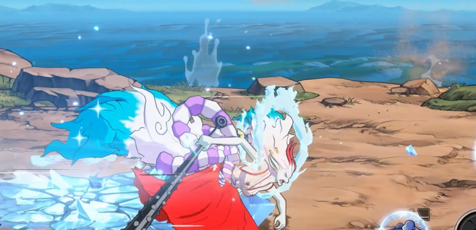 人兽形态普攻同样为五段:前两段为快速平推,附带武装色雷电;第三段为跃起踢击,可叠加寒霜层数,两次命中即触发冻结;第四段为扇形寒气喷吐,共分多次伤害判定,初始判定可被替身规避,后续判定则封锁闪避路径;第五段为高速突进+多段追击。第三段结束后反向拉杆可进入“奔袭状态”,大幅提升移动速度,并可无缝衔接第四段寒气攻击。