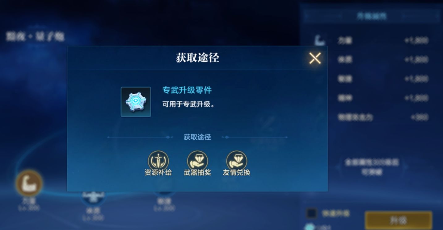 基础专武升级时,需要用到专武升级零件这一道具,它可通过资源补给、友情兑换等方式来获得,在游戏内的产量比较大,且只有升级专武这一个作用,因此玩家们在拿到足够数量的专武升级零件后可立即为专武进行升级,尽快将它转化为自己的战力,不需要留在手里。要注意,基础专武需按顺序升级,玩家需从力量开始逐一为每一种属性进行升级,等所有属性都升了一级后,才能为最初的力量属性继续升级。当全部属性升级到一定等级后,还可为专武进行突破。
