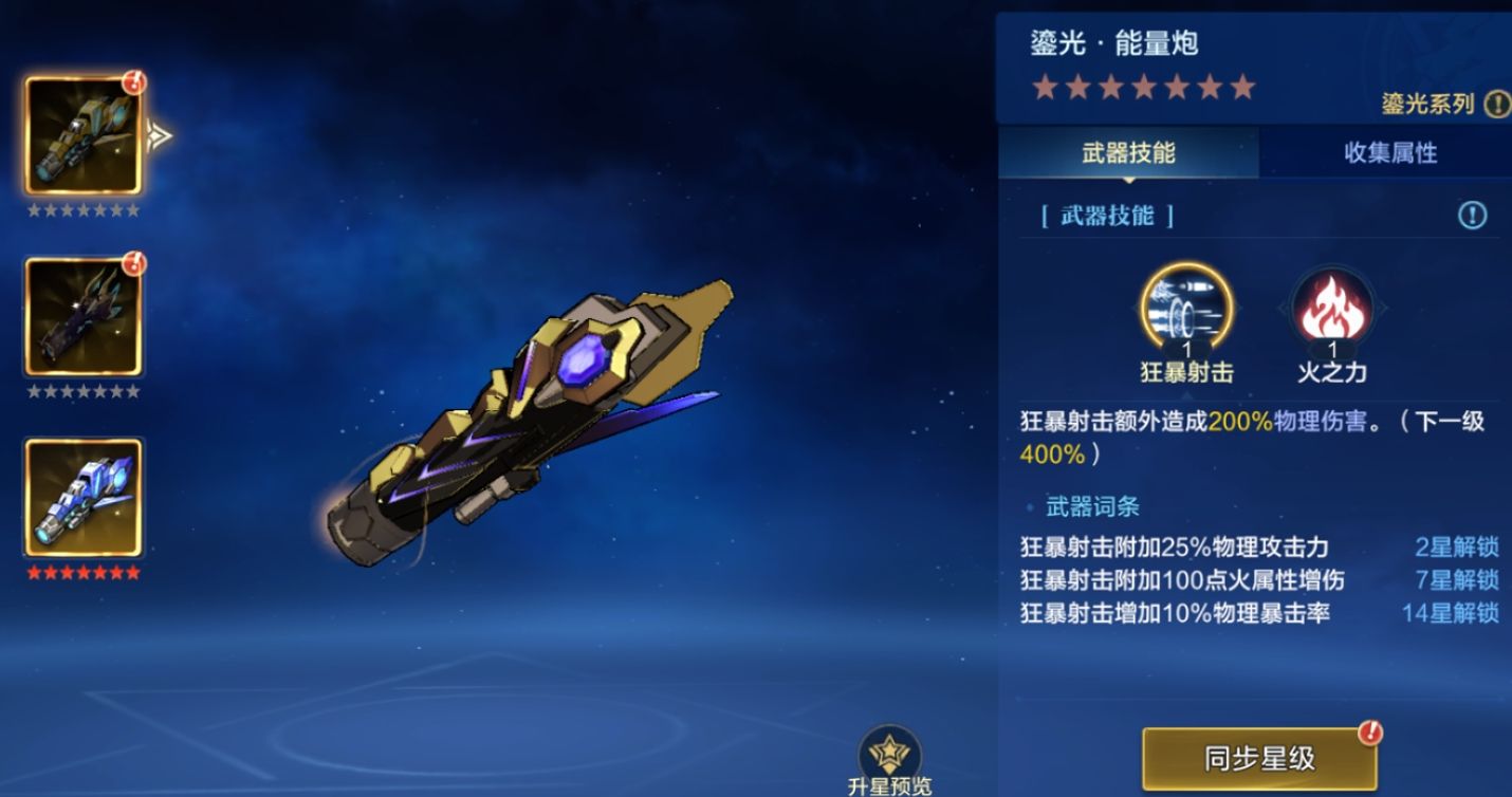 三把进阶专武分别会为不同的技能提供加成,受专武效果影响的技能会在名称上获得额外的特殊前缀,且它们在技能界面也会直接出现专武标识,玩家们可以此来确认哪些技能可获得专武带来的加成。此外,玩家们可通过游戏开放的各项活动,来获取进阶专武的升星材料,来为它们进行升星。待进阶专武的星级达到一定阶段后,还能额外解锁它们的星级能力,继续为对应的技能提供强化,星级越高,对应的技能在实战中所能造成的伤害也越高。