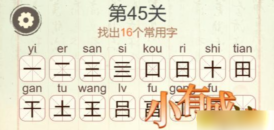 微信小游戏《聪明开局吧》第45关要求从“福”字中找出16个常用字,答案为一、二、三、亖、口、日、十、田、干、土、王、畗、吕、福、工、川。按部件由简到繁、左右分拆的顺序细心识别,即可顺利通关。